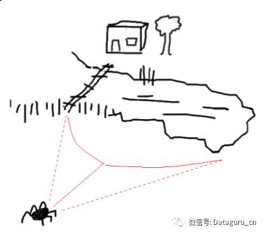 蜘蛛要回家的话,它有两个可能的路径:穿过湖上的桥或者绕着湖边走回家。在没有噪音的情况下,桥梁是比较好的选择,因为它更短。然而,在大量饮酒后,蜘蛛的运动可能会随机地左右随摇晃。考虑到桥梁狭窄,且蜘蛛不喜欢游泳,所以现在较优的选择是沿着湖边走回家。