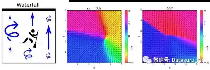 我们现在考虑一个强化学习基准,其中一个划独木舟在二维的河上划桨,如下图最左边的地图所示。在一个漂流的河中,将划独木舟推向位于顶部的瀑布,漂移在右边更强,左边更弱。 如果独木舟落下瀑布,他必须在河底重新开始。