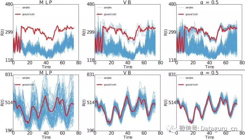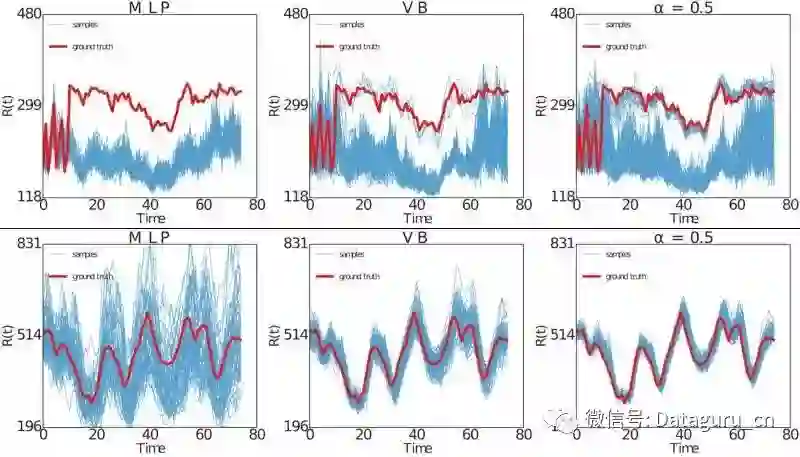 其实很有趣的一点是,VB是α发散最小化中α= 0的一种特殊情况。而另外一种众所周知的用于近似贝叶斯推理的方法是期望传播(expectation propagation),它可以由α= 1获得。在我们的实验中,我们使用α= 0.5,因为在实际情况下,这会产生更好的概率预测。关于这一点,《黑箱α发散的最小化》(ICML 2016)中有更为详尽的阐述。