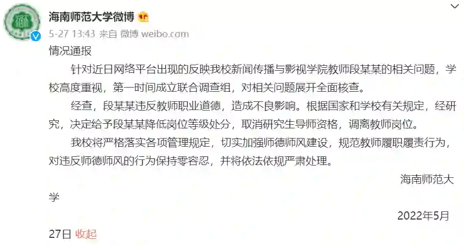 女子举报段某某后,5月27日,海南师范大学官博发布情况通报称: