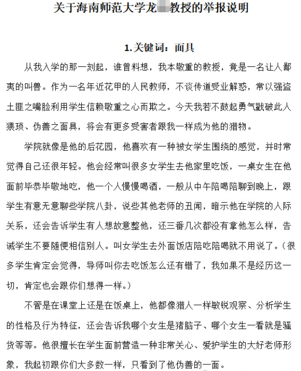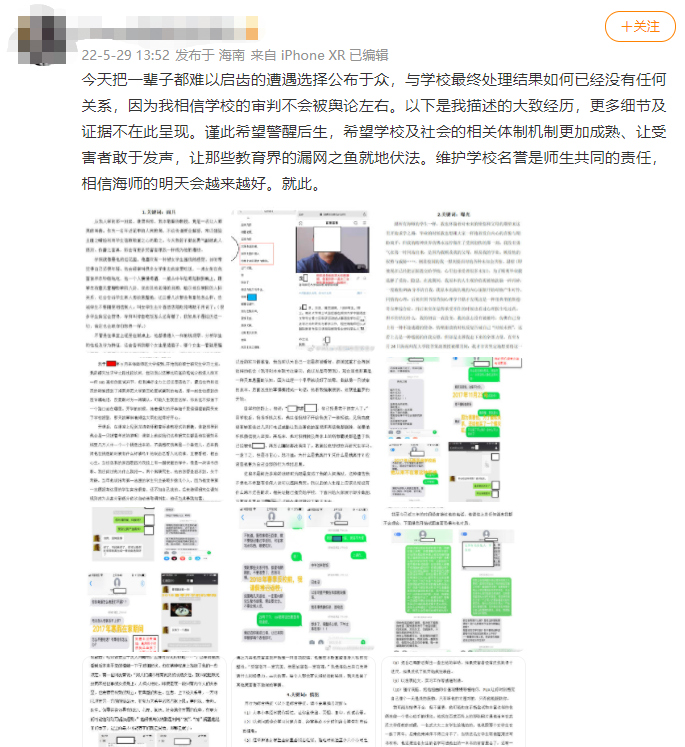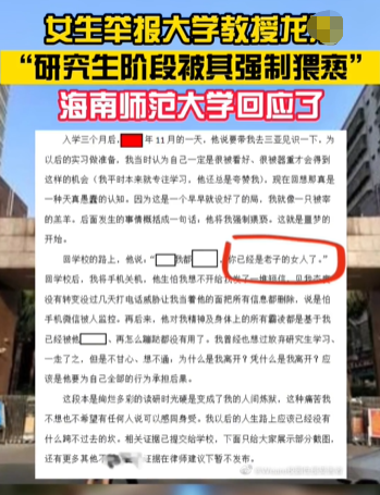 5月22日,有一微博网友发文称,她在2017年年末与海南师范大学副教授段某某在学校相识,半年后两人交往,但后来她意外得知,交往5年期间,段某某还与一位前女友和三位女学生发生过混乱男女关系。