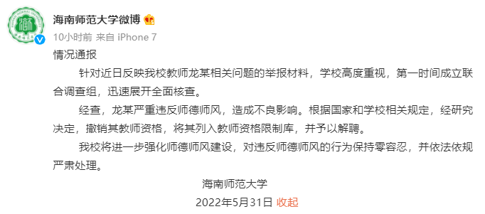 对此,5月31日,海南师范大学在官微上发布了情况通报: