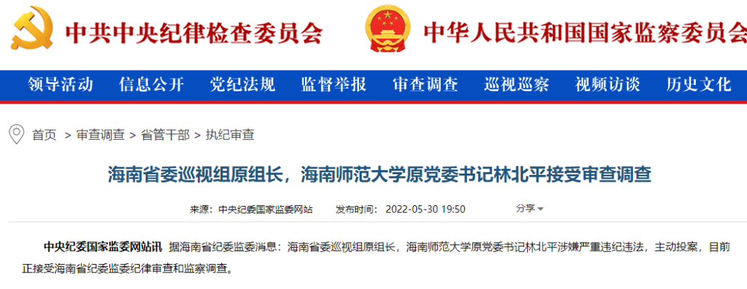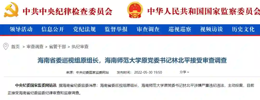同时,小募注意到,5月30日晚,中央纪委国家监委发布海南师范大学原书记被查的消息:海南省委巡视组原组长,海南师范大学原党委书记林北平涉嫌严重违纪违法,主动投案,目前正接受海南省纪委监委纪律审查和监察调查。