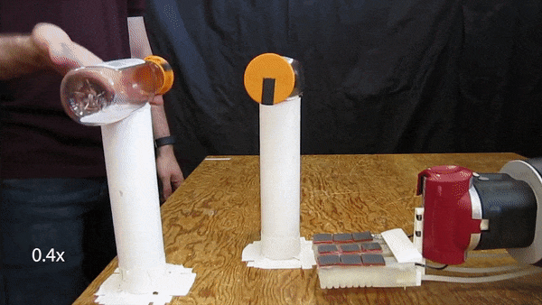 要是人类用手把瓶盖蹭掉,机器也会跟上这个节奏,把自己面前的瓶盖“踢”掉。