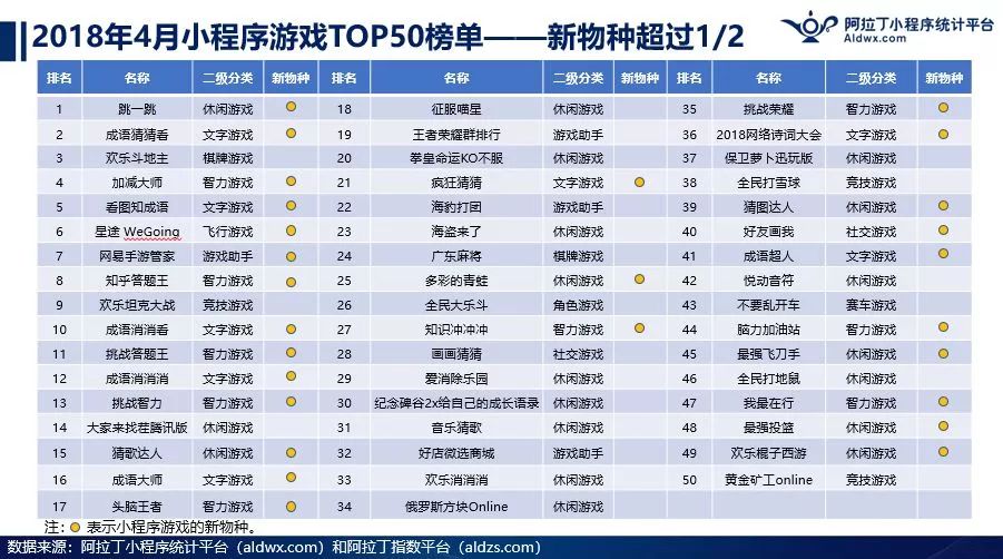 阿拉丁小程序统计平台的数据显示,在 2018 年 4 月小程序游戏榜单 TOP50 中,新物种超过了 50%,也就是说有一半是新出的游戏,《欢乐斗地主》在 APP 时代拥有数量众多的用户,但是新出的《跳一跳》直接绕过了 APP,在小程序战场实现赶超。类似的游戏还有很多,且比传统手游做得更好。