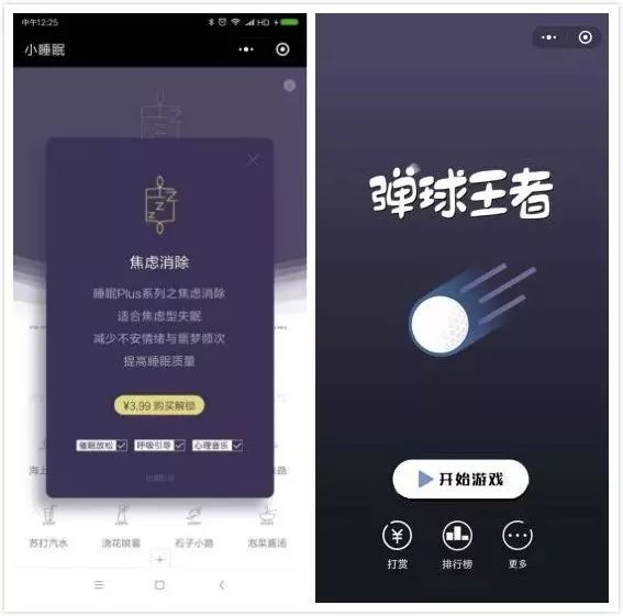 ▲左边是听音乐的小程序,有购买模式;右边是竞技类小游戏,有打赏模式