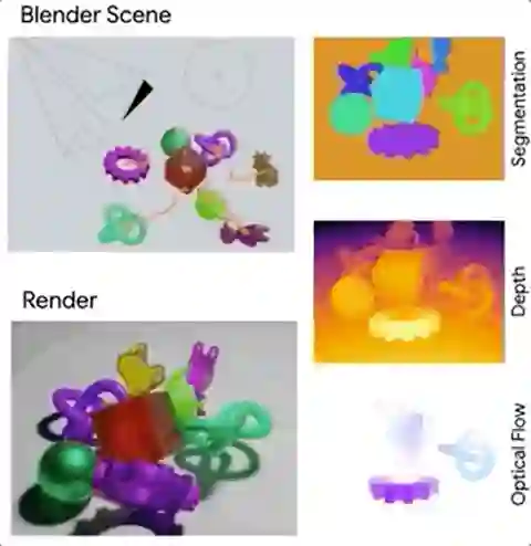 另一方面,Kubric直接提供了从“渲染数据”到输出“AI训练数据”的管道,省去了将渲染图像转成特殊数据(如深度图、光流图)、或是额外收集如视场、相机参数、光照等数据的麻烦。