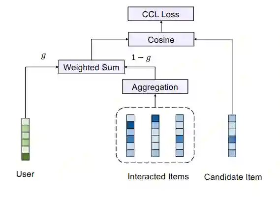 下图是本文总结的算法架构图(文中声明其并不novel,因为在多个工作中都有类似的结构,比如YoutubeNet,该文重点是在探索在这样简洁的框架下损失函数和负采样对实验结果的影响),可见其比较简单直白,用户表示方面主要是将用户的隐特征向量与历史交互物品的隐特征向量进行了加权求和,其中历史交互物品的隐特征向量通过多种聚合方式实现,然后通过将用户的特征表示与候选物品的特征表示求余弦相似度进行比较,最终利用余弦对比损失CCL进行模型优化。
