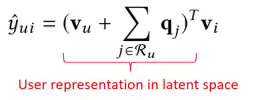 其中, 为加权稀疏,一般设为0.5。由于 可能因为average pooling操作导致的维度不对应,因此需要一个映射矩阵 来进行特征变换。个人感觉,在这里将用户隐向量与历史交互集合的物品隐向量进行融合,有些SVD++的思想在里边,只不过这里是用深度学习来进行建模,并且又添加了几种不同的聚合方式以及加权求和等操作。下图表示SVD++的预测函数,在括号内部的表示则为用户的隐特征向量,其中v表示用户向量,q表示物品隐向量。