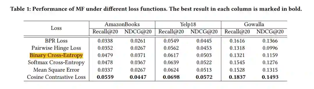 本文通过对协同过滤方法的分析,发现大多数研究都集中在交互编码器的设计上,而在很大程度上忽视了损失函数和负采样对协同过滤模型的影响。本文探索了它们的影响,并进一步提出了余弦对比损失,以及一个简单而强悍的CF基线。本文呼吁研究者们除了关注交互编码器的设计部分,还可以在损失函数以及负采样等方面进行更加深入的研究。