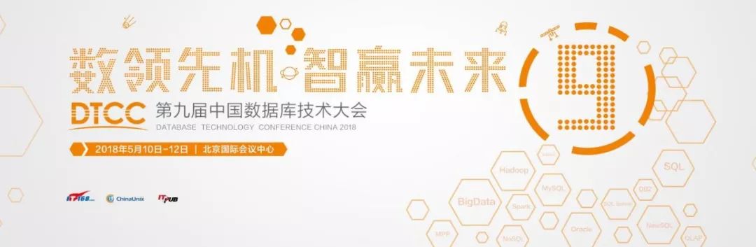 2018 年 5 月 10-12 日,第九届中国数据库技术大会(DTCC2018)将如约而至。本届大会以 “数领先机 • 智赢未来” 为主题,设定 2 大主会场及 20 个技术专场,邀请来自国内外互联网、金融、教育等行业百余位技术专家,共同探讨 Oracle、MySQL、NoSQL、大数据、机器学习、区块链、数据可视化等领域的前瞻性热点话题与技术。