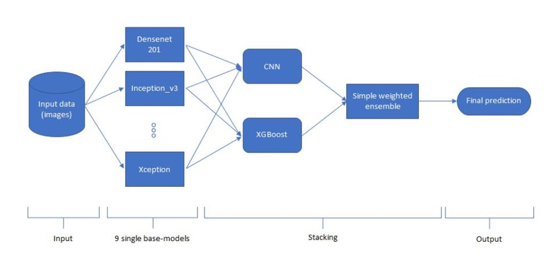 在服装第二名的解决方案中,作者采用了如下网络架构。首先开发者会采用非常多的数据增强方法增加输入图像,例如水平翻转、旋转、高斯模糊、锐化、截取和归一化等方法。然后根据 DenseNet、inception_resnet_v2、Inception-v3、Nasnet 和 ResNet-50 等九个基础卷积网络抽取输入图像的特征,并分别作出预测。最后结合所有基础模型的预测就能得出非常不错的最终结果。