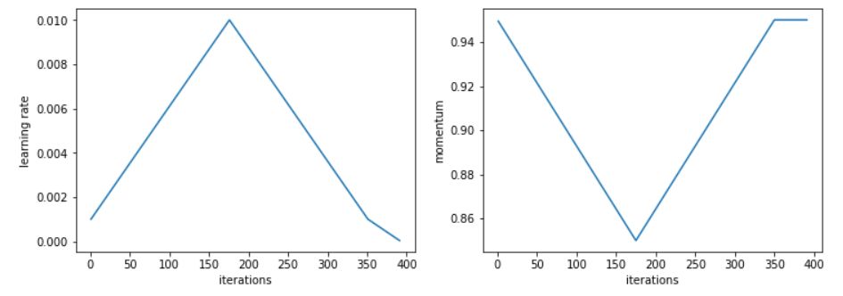 1 Cycle 用两个等长的步骤组成一个 cycle:从很小的学习率开始,慢慢增大学习率,然后再慢慢降低回最小值。Radek Osmulski 在增大学习率的同时降低动量,这也印证了一个直觉:在训练中,我们希望 SGD 可以迅速调整到搜索平坦区域的方向上,因此就应该对新的梯度赋予更大的权重。其实在真实场景中,可以选取如 0.85 和 0.95 的两个值,在增大学习率的时候,将动量从 0.95 降到 0.85,在降低学习率的时候,再将动量重新从 0.85 提升回 0.95。