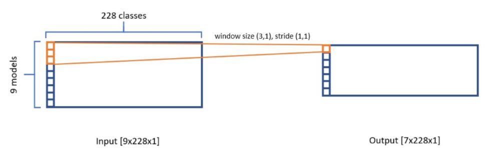 上图输出张量 7×228×8(8 个 3×1 的卷积核),在经过 16 个 3×1 的卷积核执行卷积运算并馈送到全连接层后,就能做出最终的预测。因为 3×1 的卷积其实相当于在同一个类别上,加权三个模型的预测并输出到下一层。所以这也相当于一种集成方法,模型会自动学习不同基础模型预测的重要性,并结合所有基础模型作出最终预测。