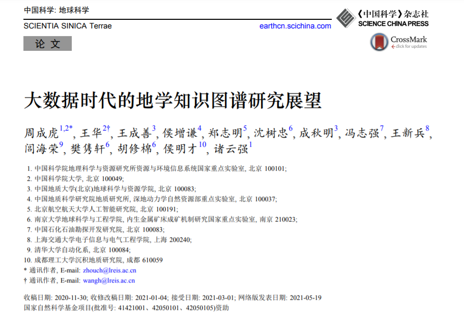 进入21世纪以来, 地球科学研究正进入一个以建立新知识体系为核心和大数据驱动为手段的重大转折时 期, 从传统的百科全书式的学科知识体系到计算机可理解与可操作的知识图谱是地学知识研究的一次革命性跃 迁. 地学知识图谱在采纳一般知识表达的图模式基础上, 拓展地学知识所特有的时空特征, 融合图、文、数等地 学要素, 从而建立全域地学知识表达模型; 发展联邦式群智协同地学知识图谱构建方法, 协同全球地球科学家, 实 现高质量的专业知识图谱构建; 发展基于深度解析的多模态地学数据动态知识图谱构建方法, 从海量的地学文献 资料中提取地学知识, 实现最新、最全的动态地学知识图谱构建. 全面而系统的地学知识图谱不仅可以深化现有 的地学大数据分析, 而且可以推进大数据驱动的高精度地质时间轴构建、规则与数据驱动的智能地图编制、地 学知识演化与推理分析等研究, 将进一步拓展数据与知识双重驱动的地学研究新方向, 开辟地球科学、信息科学 和数据科学交叉的新领域, 实现地学研究的源头创新和时空大数据研究的重大理论突破。