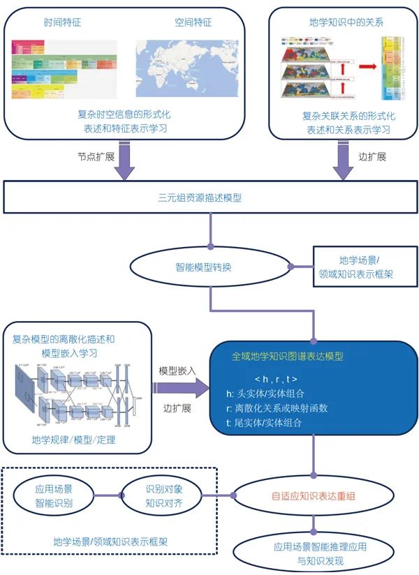 现有的地学知识表达模型一般将时间、空间和部 分属性信息进行简单的补充或记录, 难以表达复杂的 全域地学知识(张雪英等, 2020; Oramas等, 2017). 如 何从图结构本质出发, 融合地学知识中复杂的时空特 征、计算属性及地学知识关系与规则, 构建跨时空维 度的地学知识图谱表达模型, 则是一项具有重要挑战 的基础研究. 基于此, 我们提出一种由复杂时空信息 表达模型(实体对象表达模型)和地学实体对象关系 (边)构成的全域地学知识图谱自适应表达的基本模型 (图1). 该模型仍然采用头实体/实体组合、尾实体/实 体组合和离散化关系/映射函数三元组资源的描述框 架, 但在节点上拓展了时间和空间特征, 在边关系上融 入复杂模型; 在地学场景上增加了智能识别和对象知 识对齐, 对底层地学知识图谱的自适应表达形式、存 储结构等进行重组, 以适应特定场景和特定领域高效 推理的需求, 从而达到地学知识图谱在全域的自适应 表达.