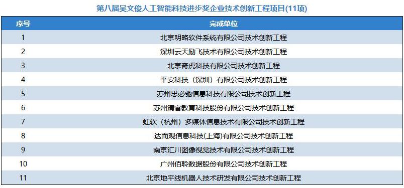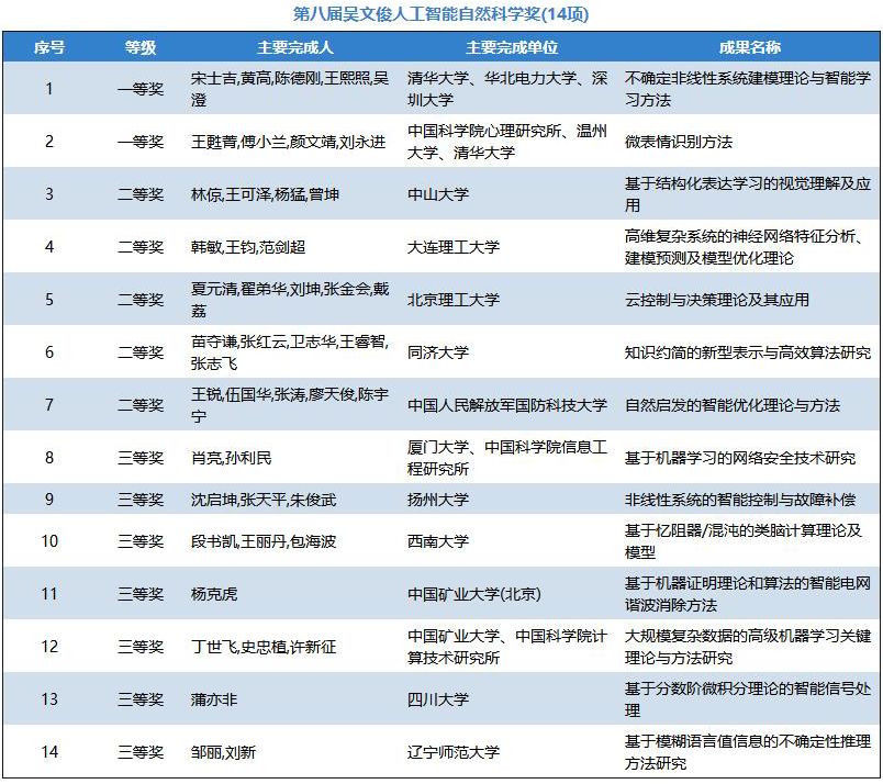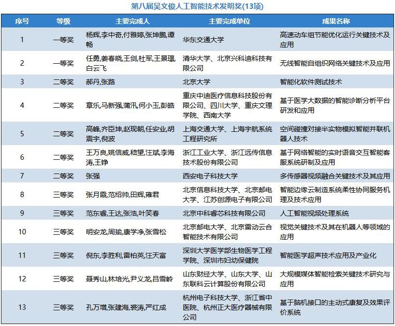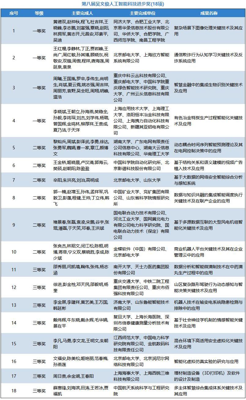 为加快实施国家创新驱动发展战略,深入贯彻《新一代人工智能发展规划》,更好地推进科教兴国、人才强国的政策落实,弘扬“尊重劳动、尊重知识、尊重人才、尊重创造”的良好风尚,通过推选优秀的智能科学技术成果及应用项目,充分调动和激发广大智能科技工作者投身建设创新型国家的积极性和创造热情,大力提升我国智能科学技术与产业应用的创新发展水平,隆重表彰在智能科学技术领域取得重大突破,做出突出贡献的单位和个人,根据《吴文俊人工智能科学技术奖励条例实施细则》规定,经各相关地方人工智能学会,全国各高校及科研(院)所、学会专委会和工委会及院士专家提名、推荐和申报,2018年9月-10月,中国人工智能学会邀请李德毅院士、谭铁牛院士、吴朝晖院士和陆建华院士和29位杰青、长江学者等专家组成评审委员会,经过初评、终评答辩和公示,第八届“吴文俊人工智能科学技术奖”共评出70个获奖项目成果,包括吴文俊人工智能最高成就奖1项(属提名制不参与公示),吴文俊人工智能杰出贡献奖1项,吴文俊人工智能自然科学奖14项,吴文俊人工智能技术发明奖13项,吴文俊人工智能科技进步奖18项、吴文俊人工智能科技进步奖企业技术创新工程项目11项、吴文俊人工智能科技进步奖科普项目1项,吴文俊人工智能优秀青年奖11项。其中,在70个获奖项目成果中,囊括有 56个高校的项目成果(包括两所军队院校)、48个企业的项目成果和7个研究院所的项目成果。中科云丛、平安科技、汇川科技、易华录、云天励飞、明略数据、奇虎360、虹软、兖矿集团、浙江远传、金碟软件、思必驰、影谱科技、地平线、山东鲁能、清睿教育等人工智能企业在本届吴文俊人工智能科学技术奖中崭露头角。