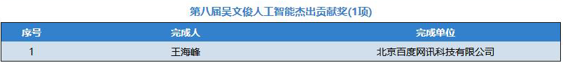 北京百度网讯科技有限公司高级副总裁王海峰因长期从事人工智能技术及产业工作,做出了大量创新成果,并在大规模产业应用中产生了巨大的经济效益和社会效益,而获得首个“吴文俊人工智能杰出贡献奖”。通报指出,共有70个项目成果摘得中国智能科学技术奖励最高殊荣。