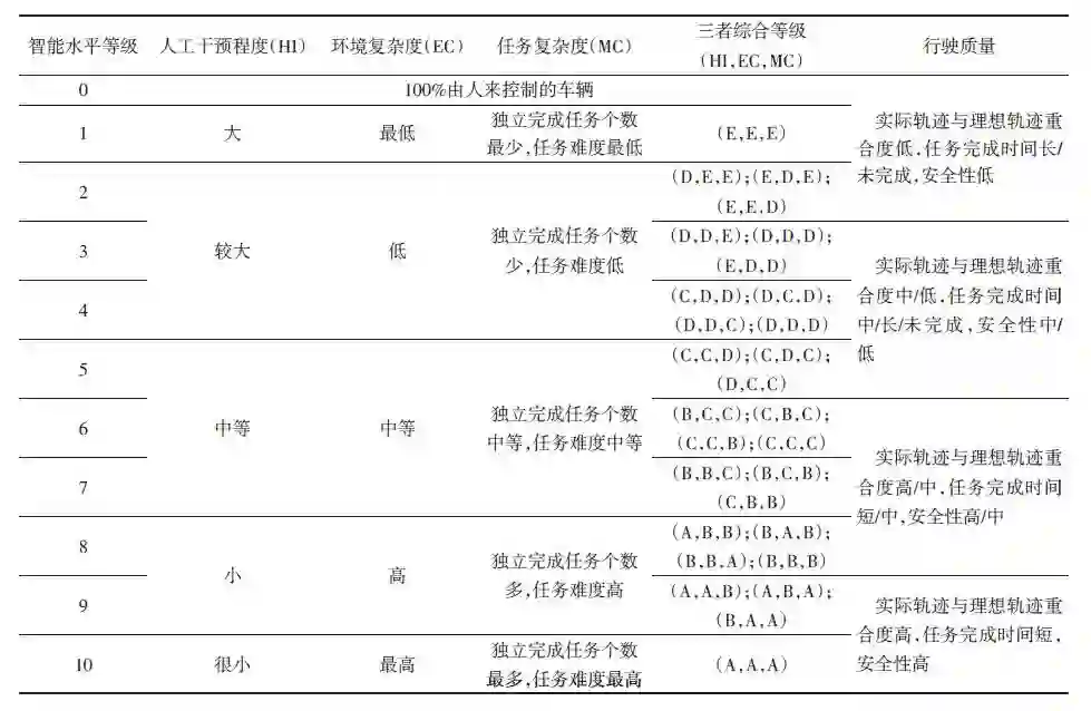 3)通过对无人驾驶车辆行驶环境的复杂程度、任务的复杂程度、人工干预的程度及行驶质量的评价,可对无人驾驶车辆智能水平进行10等级划分。