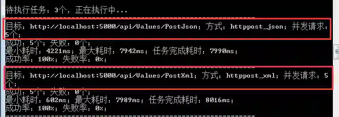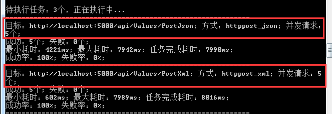 post方式传递xml参数的配置和json差不多,需要注意的是需要修改Method( "Method": "httppost_xml" ),因为工具吧xml和json的配置区分开了,下面来演示下json和xml分别配置5次请求数的效果: