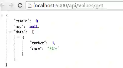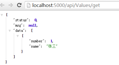 我们往测试api地址 http://localhost:5000/api/Values/PostJson 发出请求,传递学生基本信息参数,然后通过api的get接口看看效果: