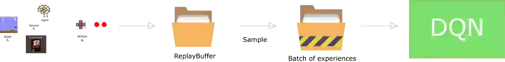 我们的解决方案:创建一个“replay buffer”存盘。在智能体与环境交互时存储经验元组,然后我们用小批量元组数据a small batch of tuple来训练神经网络。