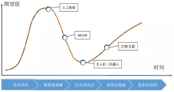 我用一个反映期望值高低的Gartner公司的曲线来说明前沿科技的发展现状。具体来讲,万物互联或物联网实际上已经走出发展低谷,进入到我们称为“理性的爬坡”的发展阶段。我们所投的公司中也有一系列物联网领域的创业公司,比如我们投资的两家公司针对非常小众的智能硬件产品视频门铃,一家是我们在中国投资的这一领域市场份额最大的移康,其销售额已经达到上亿人民币,另一家我们在美国投资的也是这一领域市场份额第一的Ring,销售额达到数亿美金。这两家公司经过四五年的发展,都实现了盈利,并且有着非常健康的发展趋势。在智能可穿戴领域,我们投过的手环公司Fitbit也已经成功上市。但整体而言,曾经非常火爆的智能可穿戴领域的大部分公司都处于发展低谷,还没能进入到“理性的爬坡”阶段。