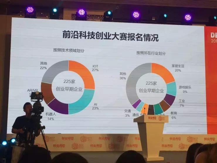 本场大赛命名为“前沿科技创业大赛”,那么什么是前沿科技。我们所定义的前沿科技包括四大领域——人工智能、XR(XR=AR、VR、MR)、机器人/无人机和万物互联。我们也对今年报名参赛的225家初创企业做了统计分析,以进一步了解创业趋势。