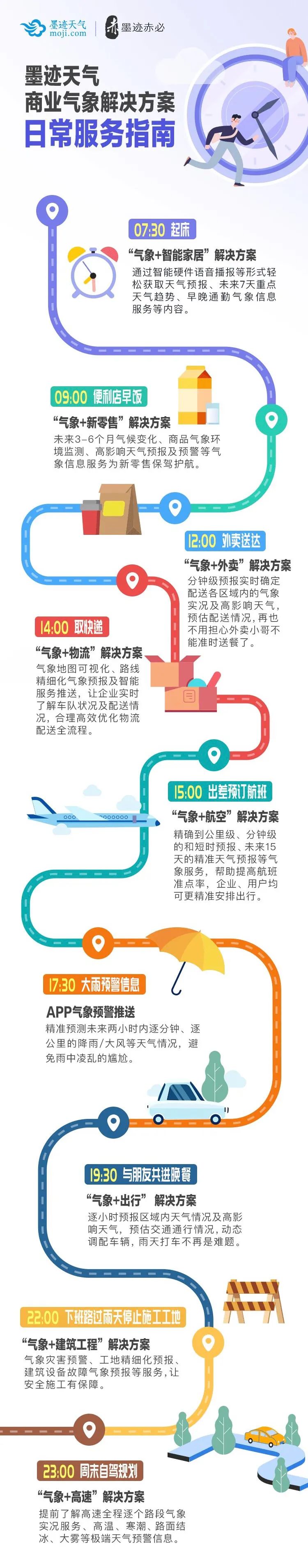 基于此,自2月11日起,墨迹天气决定把自己长期建立起来的气象服务能力分享出来,帮助受疫情影响较大的物流、外卖、航空、新零售、高速公路、智能家居、工程建筑等与生活息息相关同时又受疫情影响较大的行业减少降低短期内的经营现金流成本,同时通过精准的气象服务为企业在供应链、效率、库存等方面的决策提供支持。