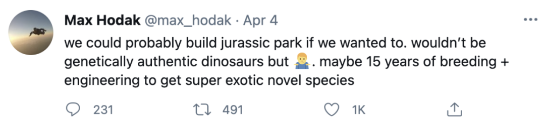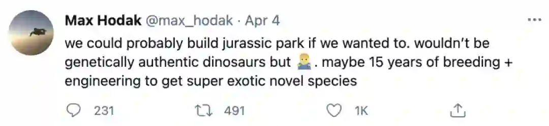 不过,Hodak 虽不像马斯克那样「疯狂」,但是其曾经在社交媒体上表示,目前科学家已经掌握「创造侏罗纪公园的技术」。