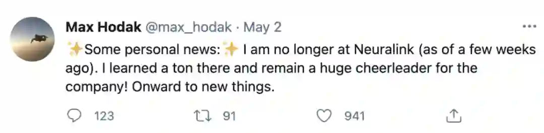 Max Hodak 发推表示,「我已经在几周前离开了Neuralink去接触其他新鲜事物,在这家公司学到了很多东西,虽然不再任职但仍然会为该公司宣传。」