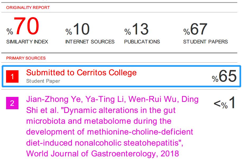 小 s 赶紧看了最新的 Turnitin 检测报告,显示文章居然和一个美国的 Cerritos College 的学生论文相似度 67%。