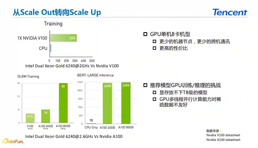在使用GPU单机8卡机型的情况下,可以使用更少的节点。在分布式的深度学习系统中节点减少之后跨机的通讯会更少,同时减少了节点的异构问题,并且具备更高的性价比。在使用GPU的时候主要面对的问题在于显存内无法存放TB级别的模型,GPU的多线程并行能力对稀疏数据不够友好。
