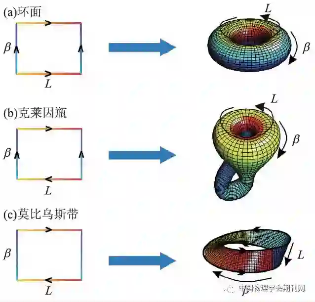 图3 3 种两维流形上的路径积分,箭头方向代表粘接方式。当两边为周期边界条件时,按照平直和扭曲粘合得到(a)环面和(b)克莱因瓶。一边为开边界条件、另一边为周期边界条件,扭曲粘合,得到(c)莫比乌斯带