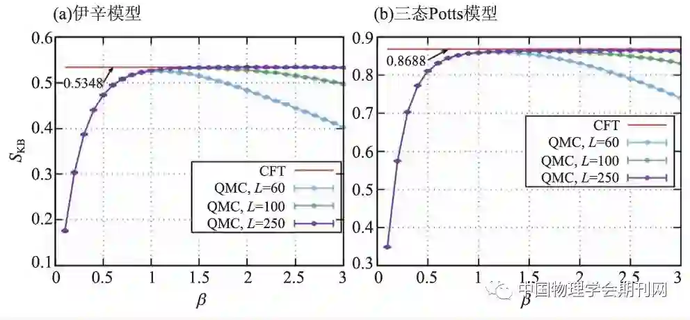 图5 通过(a)量子伊辛模型和(b)量子三态Potts 模型比较量子蒙特卡罗计算与共形场论预言的克莱因瓶熵[5]