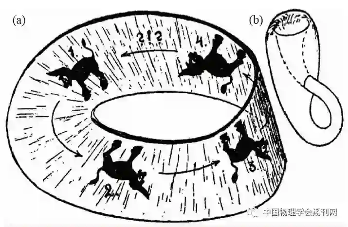 看似平淡无奇的一扭赋予了莫比乌斯带和克莱因瓶非同寻常的拓扑性质。而把这些流形想象成世界的话,在其中生活的生命也会体验到奇妙的物理性质。著名理论物理学家伽莫夫在他的经典科普著作《从一到无穷大》中论述了有手征的物体在莫比乌斯带上旅行的有趣体验[1]。对于不对称物体,我们总可以分出其手征,例如手套可以分出左手系和右手系,它们“非常相似但又极为不同”。图1(a)所示的非对称纸片驴也有手征:在莫比乌斯带1 号位置的纸片驴是“左手的”[2],如果不把驴拿开纸面,无法通过在纸面内原地旋转而改变其手征。如图1(a)中所示,我们从三维空间看过去,纸片驴按照箭头所示的逆时针来运动,当纸片驴历经2—3—4 回到1 位置的时候,我们发现纸片驴四脚朝天, 如果将它“ 正过来”,会惊讶地发现二维驴变成了“右手系”!我们从三维空间来观察,能够获得非常全面的视角,清楚地了解到纸环是否有扭曲。但是二维的纸片驴并不能轻易知道它生存的空间是通常的纸环还是莫比乌斯带。它唯有环游世界,回到原来局域的坐标架下来观察自己手征的改变与否,才能判断空间的整体性质。