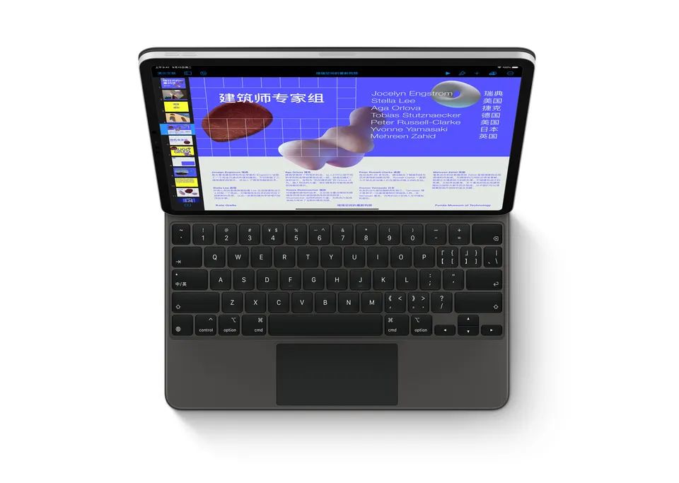 但稍有不同的是,「妙控键盘」自带一个触控板,而且采用了悬浮式支架设计,通过磁力吸附来和 iPad Pro 连接。更重要的是,「妙控键盘」的键位为一毫米键程剪刀式结构和全背光设计,对于文字工作者来说都是极具吸引力的升级。