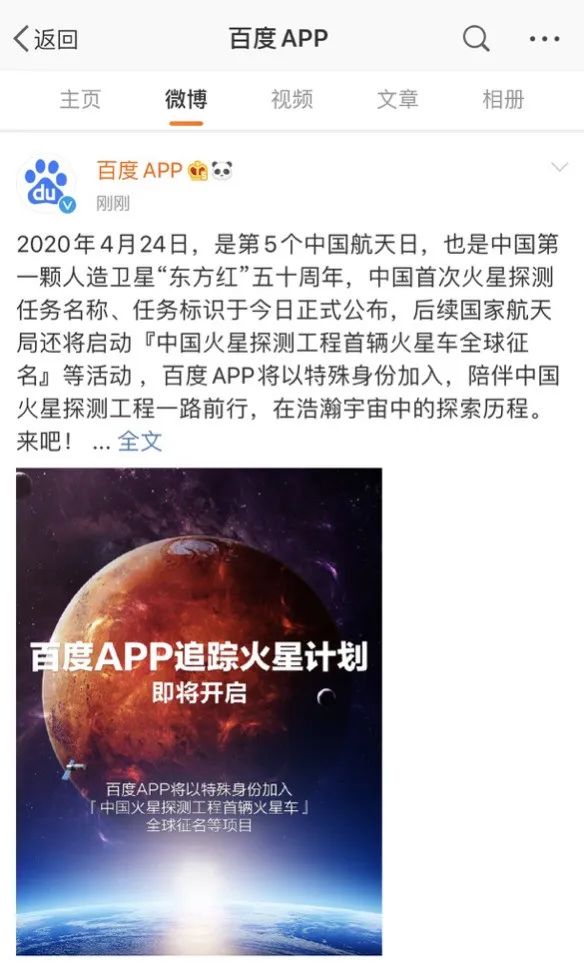 因为就在当天,百度App上一搜即见的——“追踪火星计划”——还获得官方认可,以特殊身份加入中国火星探测工程相关项目。