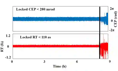 实验的关键光路如图1所示,由飞秒钛宝石放大激光器输出的光脉冲,经充气中空波导(Hollow fiber)展宽光谱后,利用分束镜分为两路,分别通过两组啁啾镜组进行脉冲压缩,之后由合束镜合成,分出小部分到f-2f系统进行CEP测量。通过优化实验系统,最终同时实现了CEP与RT的长时间锁定,锁定时长超过8小时,图2所示为典型的长时间锁定结果。