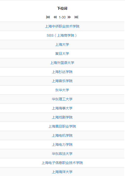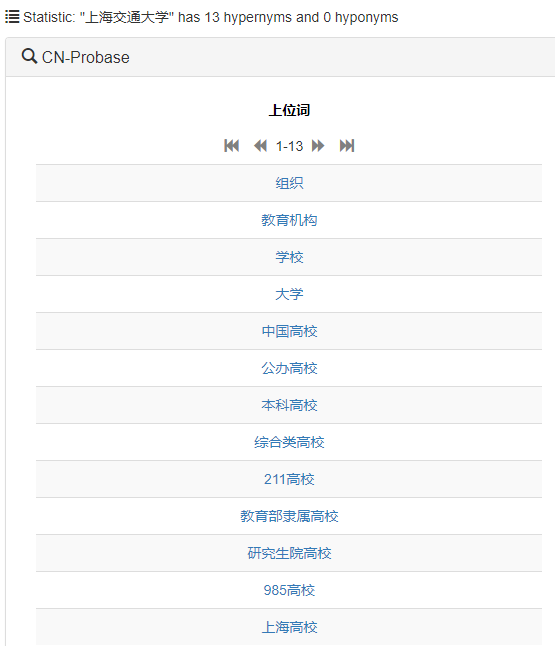当用户需要判断“复旦大学”和“上海交大”是否相似时,仅仅根据字面相似性,很难知道它们是相似实体。但是通过CN-Probase,我们可以看到它们的概念是差不多的(如下图),从而可以判断它们在语义上是相似的。
