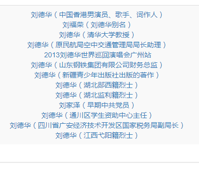 二、严格按照实体进行组织,有利于精准理解实体的概念。例如,“刘德华”这个名字,可能对应很多叫“刘德华”的人,在CN-Probase里搜索“刘德华”,会出现按照典型性排序的很多实体,排在第一个的是大家提及名字都会联想到的歌手“刘德华”。