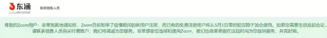 InfoQ 记者就此事前去求证,发现 Zoom 的中国授权经销商东涵电信官方显示着这样一则通知: