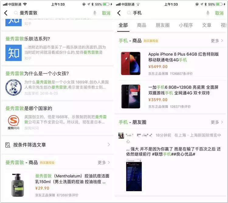 因为搜索内容的不同,在“全部”功能块下显示的结果顺序也不同,比如搜索“手机”后第一行就是商品链接,而搜索“曼秀雷敦”,第一屏的显示的搜索结果顺序则是——公众号-小程序-百科-朋友圈文章-然后才是商品链接。