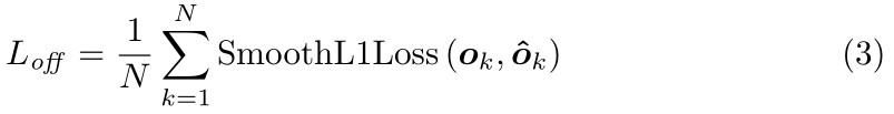 其中ok为偏移,xk,nk为第k个角在原图的坐标。网络分别为为所有类别的左上角和右下角各输出一组预测偏移,仅有正样本点有损失,损失函数为smooth L1: