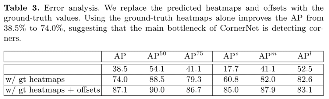 误差分析 网络同时预测了热图,偏移和嵌入向量。每一项都会影响检测精度。通过用ground truth热图和偏移替换预测值来评估每部分的误差。