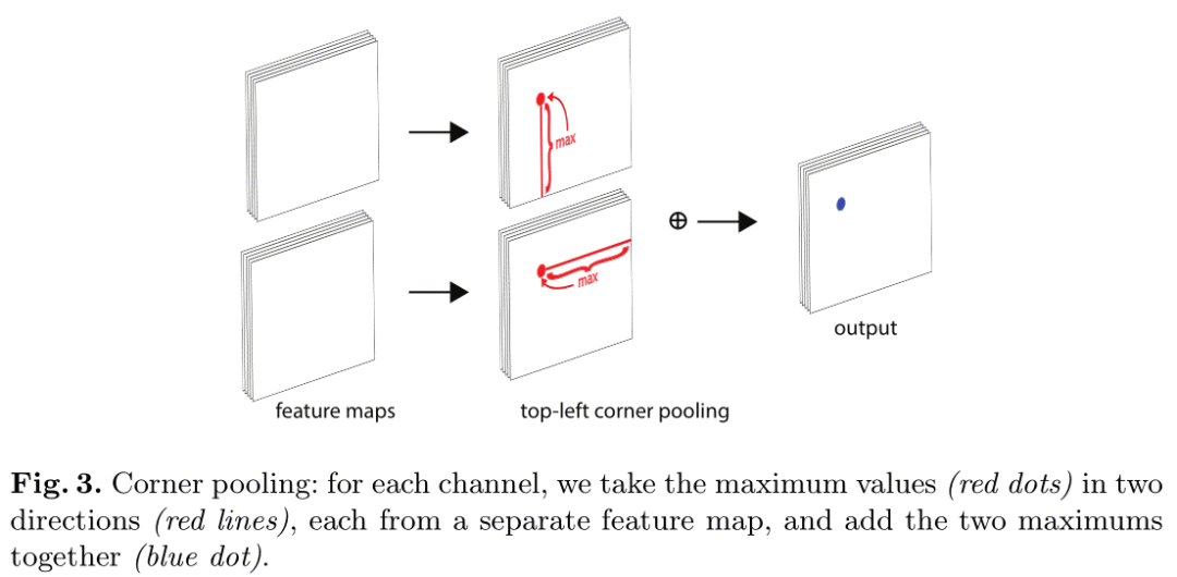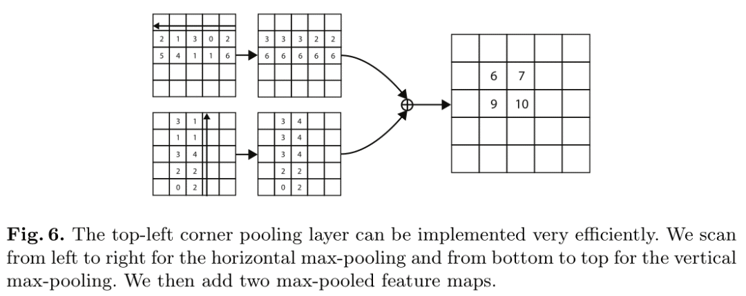 当判断某个像素位置是否为目标的左上角时,需要沿着水平方向向右看目标的上边界,沿着垂直方向向下看目标的左边界。corner pooling层基于此原理,输入两个feature map。对于第一个feature map,每个像素位置对其右侧所有向量进行最大池化;第二个feature map上每个像素位置对其下方所有向量进行最大池化,然后将两个池化后的feature map相加得到输出。过程如下图: