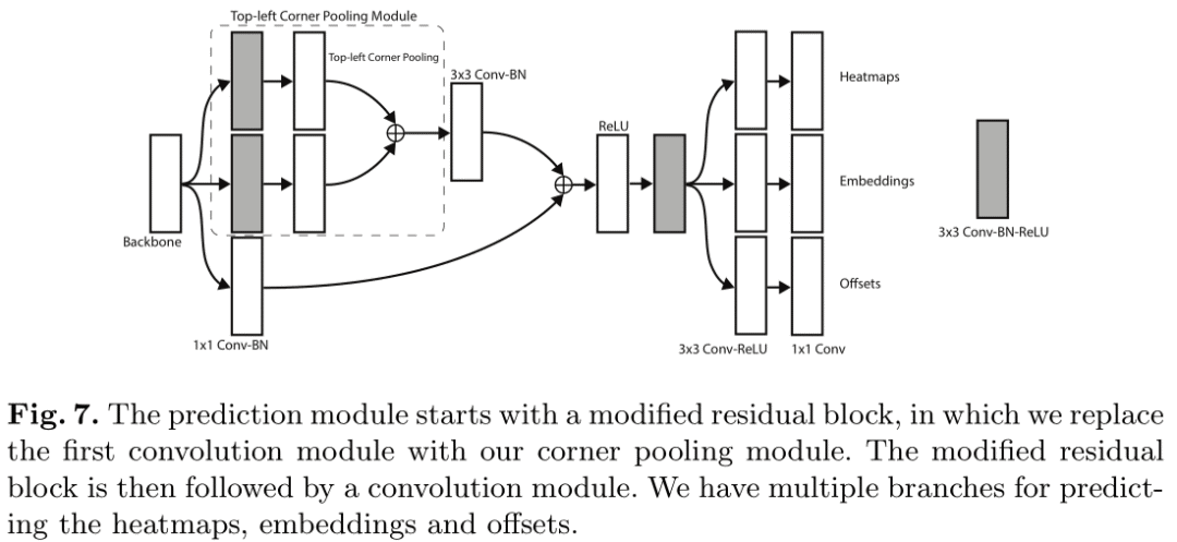骨干网络使用hourglass网络,其后是两个预测模块,一个负责预测左上角,一个负责预测右下角。每个模块内都有自己的corner pooling层,池化之后预测热图,嵌入向量和偏移。CornerNet仅适用最后一层进行预测,没有使用不同尺寸的feature map来预测不同大小的目标。