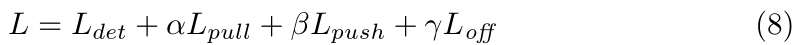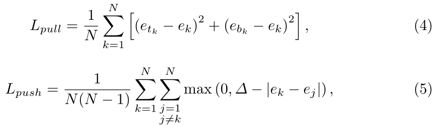通过预测每个角的嵌入向量判断某个预测的左上角和右下角是否属于同一个目标。属于相同目标的嵌入向量距离近,因此之后可以根据向量距离给角分组。 作者使用1维的嵌入向量。记etk为物体k左上角的嵌入向量,ebk为右下角的嵌入向量。使用"pull"损失使目标的两个角距离近,使用"push"损失使不同目标的角距离远: