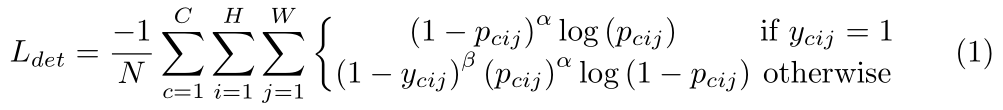 记pcij为类别c在热图(i,j)位置上的得分,ycij为带有高斯函数的ground truth热图,检测的损失函数基于Focal Loss: