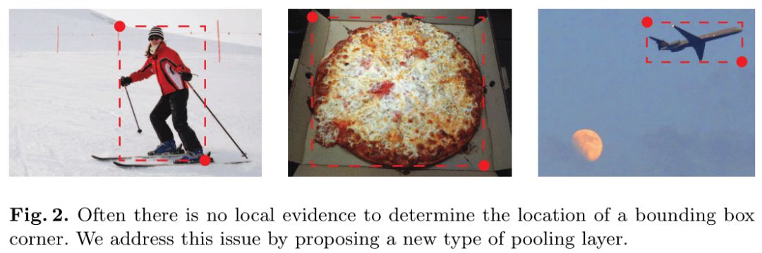 CornerNet中提出了一个corner pooling层,帮助网络更好的定位bbox的两个角。因为bbox的两个角通常在目标区域之外,如下图所示: